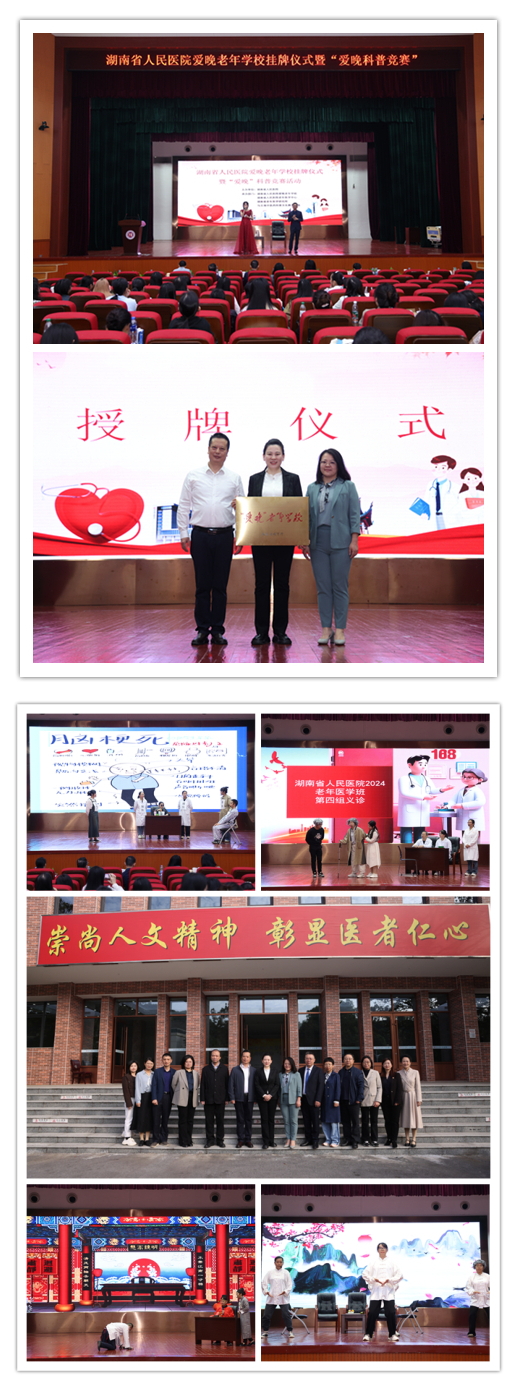10月25日上午,捷克论坛 爱晚老年学校挂牌仪式暨科普竞赛活动在马王堆院区成功举办。捷克论坛 党委副书记朱丽琴、湖南省教育厅职成处副处长殷劭、长沙市教育局副局长杨庆江、长沙市教育局高教处处长范霖、湖南省开放大学终身教育指导服务中心副主任刘姣、湖南省卫生健康委医政处干部周洲、红网健康频道主编周曼,湖南省老年医学研究所副所长兼马王堆院区执行院长张超杰、老年医学科学科主任梁力晖出席了活动。会议由捷克论坛 老研所所长李强翔主持。捷克论坛 相关科室主任、2024年全国(湖南)老年医学人才培训项目相关临床科室教师代表及全体学员、院内离退休职工、周边社区老年人代表近300余人参加了活动。