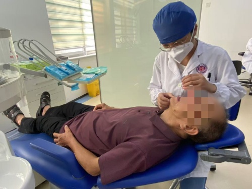 修复专家熊瑛副主任医师经过仔细检查发现,李爷爷患有牙周病、龋齿、残根、下颌无牙颌,有冠心病史,为此熊瑛副主任医师为李爷爷进行了下颌吸附性义齿修复,李爷爷当天戴上了吸附性义齿,当时就啃上了苹果,彻底解决了“没牙”的烦恼。
