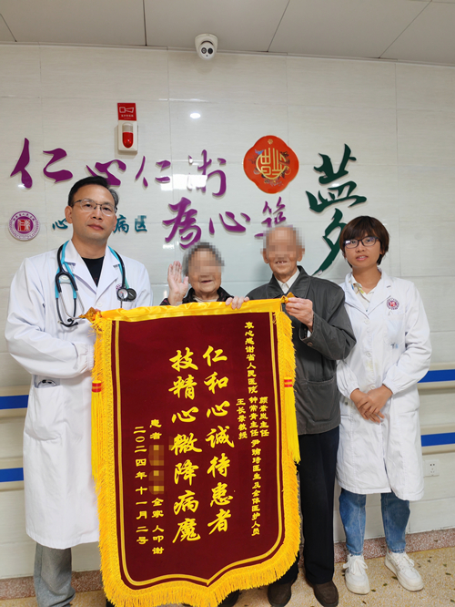 出院前,患者及其家属为了表达对医护团队的深深敬意和感谢,精心制作了一面写有“仁和心诚待患者,技精心微降病魔”的锦旗送给心内科医护团队。这面锦旗不仅是对心血管内科团队技术的认可,更是对医者仁心的最高赞誉。心内科医护团队也表示,今后将用爱心、耐心去关怀每一位患者。(心血管内科二病区 陈婷 李利花 颜素岚)