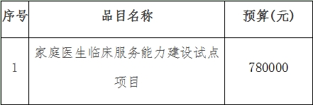 )家庭医生临床服务能力建设试点项目。预算金额:¥780000.00元