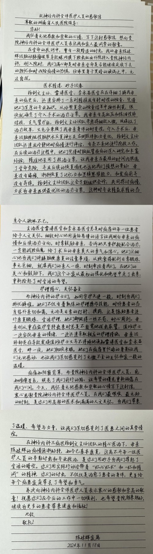 近日,神经内科三病区上演了感人一幕,医护人员们收到了一封饱含深情的手写感谢信,字里行间满是对他们专业救治与悉心照料的感激之情。