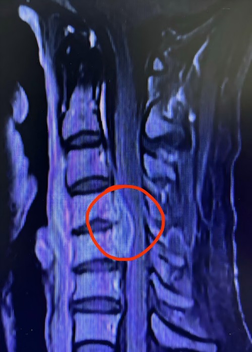 患者颈椎磁共振(MRI)显示椎管内有大量脓液