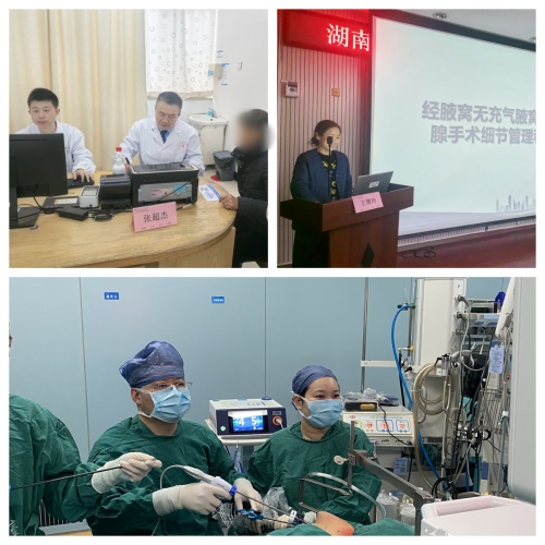 义诊结束后,由武亚琴医师担任扶镜手,张超杰教授和王慧玲教授分别演示了1台无充气经腋窝入路的腔镜甲状腺癌根治手术,手术均顺利在1小时内完成。该术式在保证根治疾病原则的前提下,保留了颈前功能区无任何损伤,既微创、又美观的解决了2名患者的甲状腺疾患,避免了颈部手术疤痕。平江县第一人民捷克论坛 乳甲外科惊叹扶镜手与主刀的完美配合、表达了感谢与希望进一步合作的愿望。同时,曾政主治医师也为2名乳腺良性肿瘤进行了微创旋切手术。此次活动得到了当地群众的高度好评与赞许,纷纷表示不用去省城,在家门口就享受到省级三甲捷克论坛 知名专家的优质诊疗服务,实现了当日看病,当天手术,给平江县百姓带来了实实在在的健康福利。惠民、便民、亲民、爱民,一切为了人民健康,这是捷克论坛 一直践行的理念。