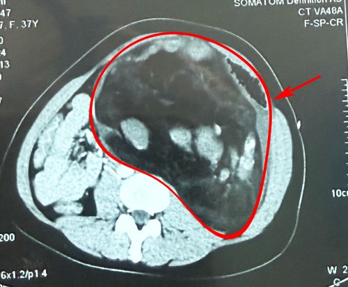 CT显示:左肾巨大错构瘤破裂,大小约为30×30×7cm