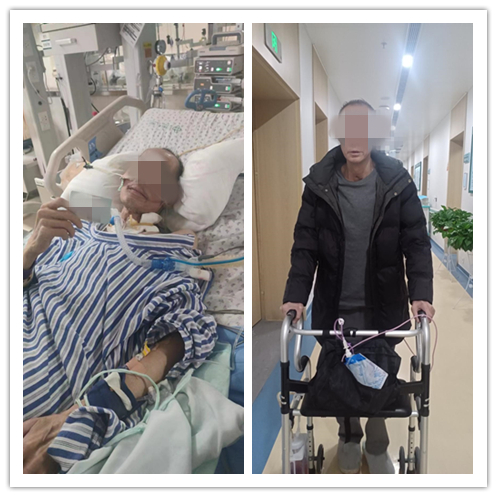 经过近2个月的系统治疗,李先生的成功脱下有创呼吸机,气管切口顺利封堵,更令人振奋的是,原本肌肉萎缩无法坐立的他,在呼吸重症康复团队协助下,从床旁坐位平衡训练起步,逐步实现辅助站立、短距离步行。目前,他已能自主行走200米,体重增加10余斤,终于露出了久违的微笑,对抗战疾病更是充满了信心。