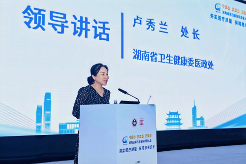 湖南省卫生健康委医政处处长卢秀兰出席会议开幕式并讲话。她表示要筑牢防线,强化院科质控,构建源头管控、动态监测、快速响应的预警处置机制;要严守红线,重点强化全员培训与演练,确保十八项核心制度刚性落地,让安全规范融入职业本能;要创新路线,突破思维定势,善用质量管理工具与智能手段,驱动质量精细化管理与持续改进,激发高质量发展内生动力。