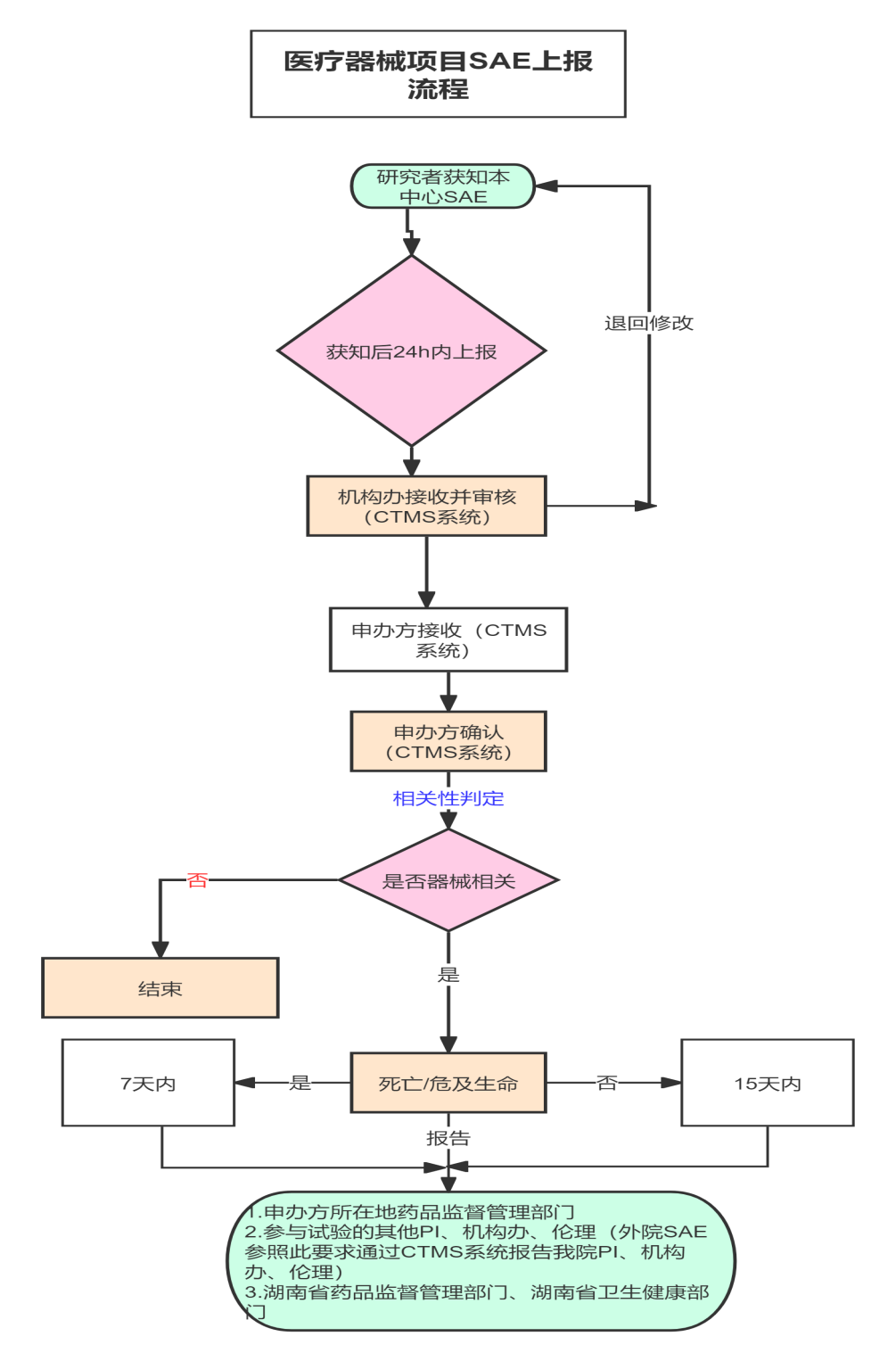 2.申办者/CRO在对死亡或者危及生命的临床试验医疗器械相关严重不良事件7日内、对非死亡或者非危及生命的试验医疗器械相关严重不良事件和其他严重安全性风险信息15日内向其他医疗器械临床试验机构、主要研究者、伦理委员会报告,同时向申办者所在地省、自治区、直辖市药品监督管理部门报告,向湖南省药品监督管理部门和卫生健康管理部门报告。