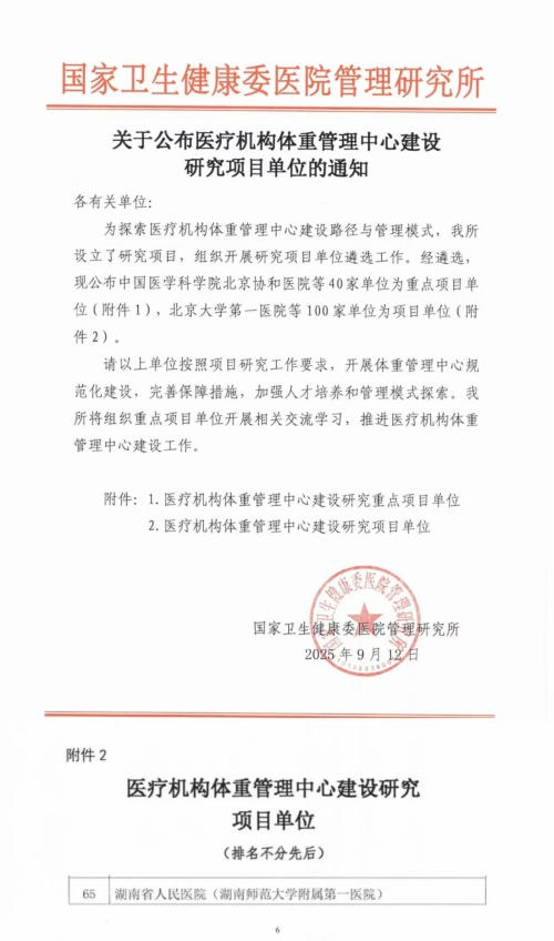 9月13日,国家卫健委医管所公布了医疗机构体重管理中心建设研究项目立项名单,捷克论坛临床营养科申报课题再度获批。本次体重管理中心建设实行院长负责制,联合17个科室、覆盖三个院区,全院协同、全力推进,严格按建设标准推动项目落地实施。从捷克论坛 层面到政府项目支持,再到基层体重管理门诊建设与专业人才培养,各项工作稳步推进。自湖南省卫健委工会依托捷克论坛发起“健康体重、医者先行”活动以来,该项目已在全省范围内广泛推广,捷克论坛正逐步成为区域体重管理工作的引领者和推动者。