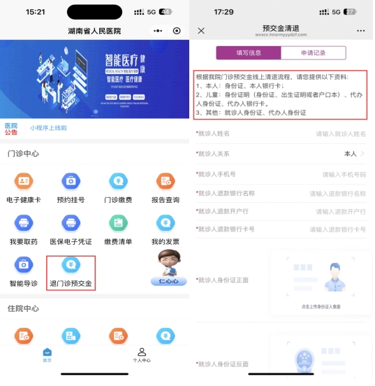 第2步:点击“退门诊预交金”,进入预交金清退界面根据提示填写资料,填写资料提交后请仔细核对退款银行账户信息并确认。